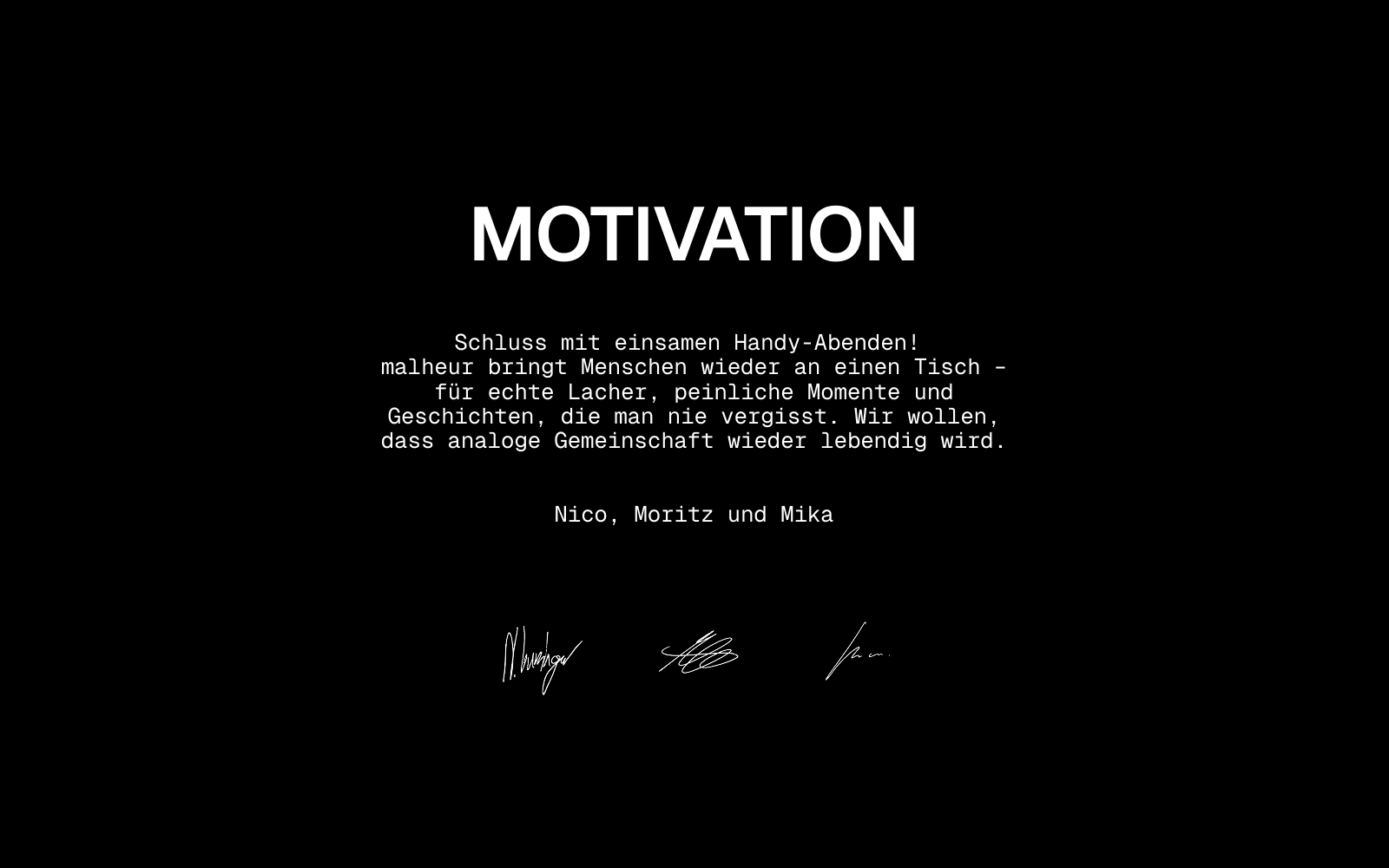 "Malheur" ist ein Gesellschaftsspiel, das Glück, Schadenfreude und Mut kombiniert. Bis zu acht Spieler würfeln um ihr Schicksal – wer verliert, kassiert Verlierergegenstände und muss am Ende eine gemeinsam festgelegte Bestrafung ausführen. Einfach erklärt, schnell gespielt und voller Lacher.